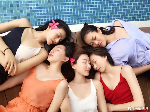新浪娱乐讯 4月3日,高圆圆[微博]晒出一组闺蜜五人团的度假照片,并配文“22年了,你们还是我眼中最美的姑娘”,并@了剩下四位闺蜜。照片中,五位姑娘头戴五瓣花,身材苗条,面容清秀,躺在泳池边闭目养神,夏日长裙色彩缤纷,构成一道迷人养眼的风景线。