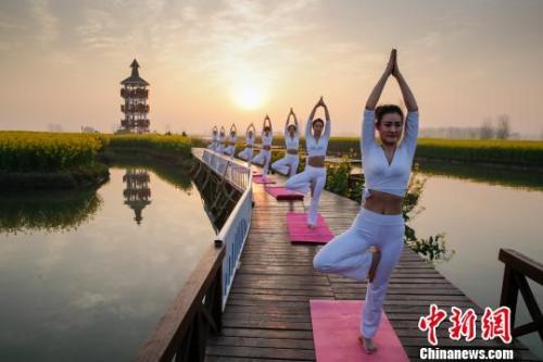 图为瑜伽爱好者在兴化千垛菜花景区表演瑜伽技艺。 汤德宏 摄