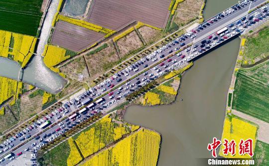 当日是清明小长假的第二天,从空中鸟瞰千垛菜花风景区人流如潮,来自全国各地的旅游大巴、轿车等众多社会车辆在景区周边的公路上绵延数公里排起了长龙,场面十分壮观,公路也变成了一个临时“超级停车场”。