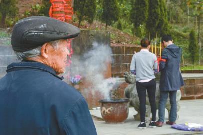 3月28日,清明节前,仁寿县虞丞乡丞相村,87岁的宋克成老人正在抹去墓碑上的浮尘。
