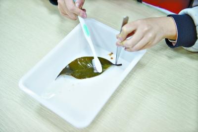 朱怡璇提供了刷叶肉的小窍门:“以叶柄为中心,从中间往两端顺着一个方向刷,能够较好地刷去叶肉。刷叶缘的时候要格外注意,谨防损坏。”