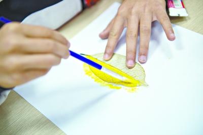 蔡定言给他的叶脉书签刷上了渐变色,他建议同学们在染色时可以直接将颜料加入少量水中,让叶片完全浸润于颜料水充分着色。同时也可更好地保护叶片。记者黄洁莹 通讯员王彩霞