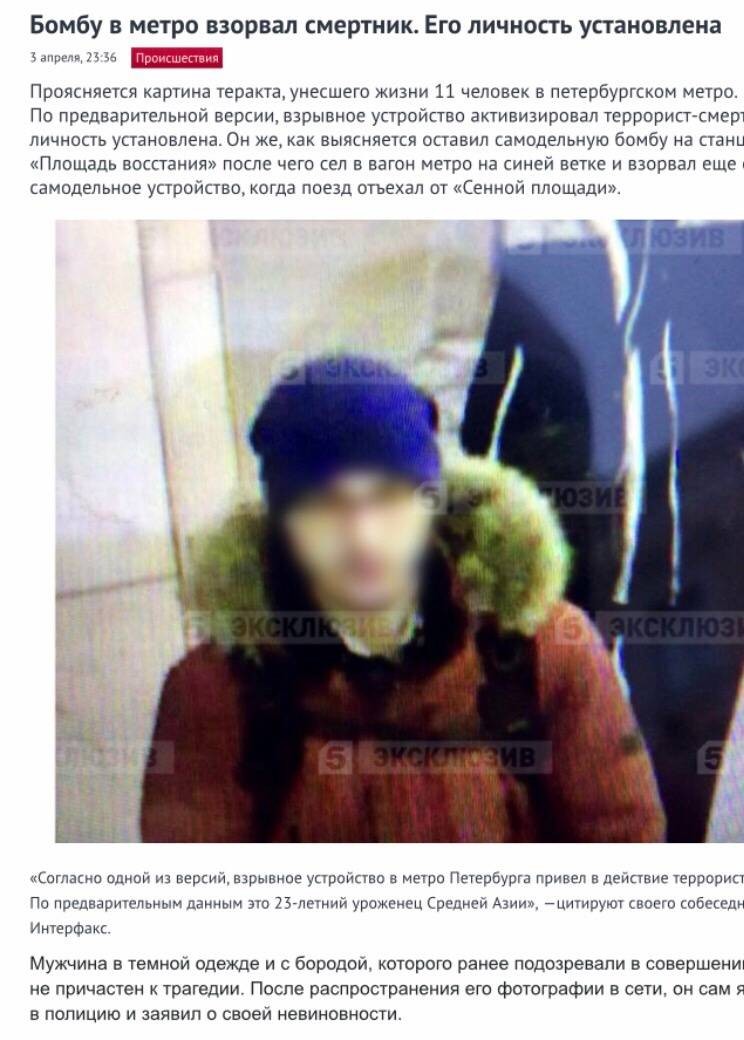 俄罗斯REN电台在Twitter上公布了嫌疑人照片,调查人员称不排除该男子是故意打扮以迷惑众人的可能性。据称,该男子在爆炸前20分钟进入地铁“彼得格勒”站。