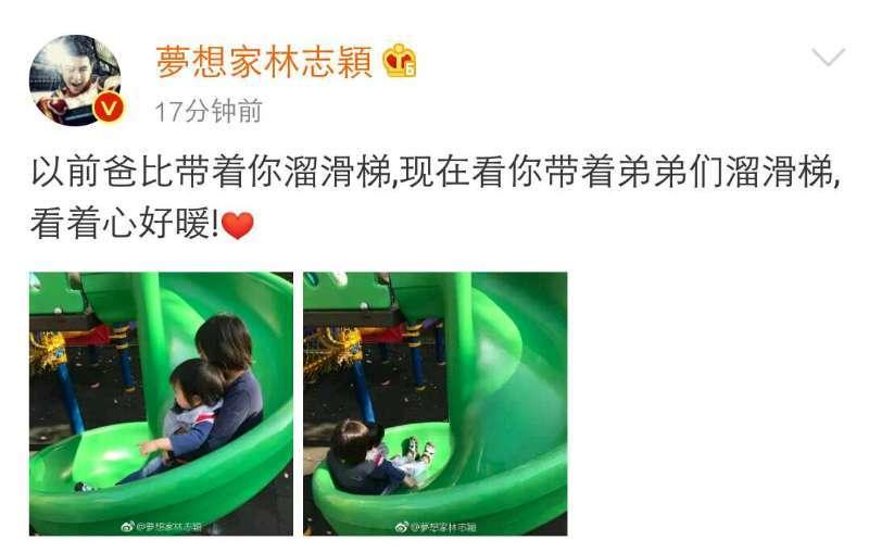 腾讯娱乐讯 林志颖一家在结束假期旅行后归来,昨晚林志颖在微博晒出了Kimi和双胞胎弟弟玩耍的照片。