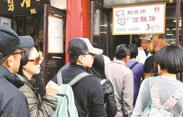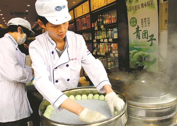昨日是清明节,苏州观前街多家百年老店推出春季时令食品青团子和酒酿饼,吸引众多游客前来品尝。 王建中摄 视觉江苏网供图