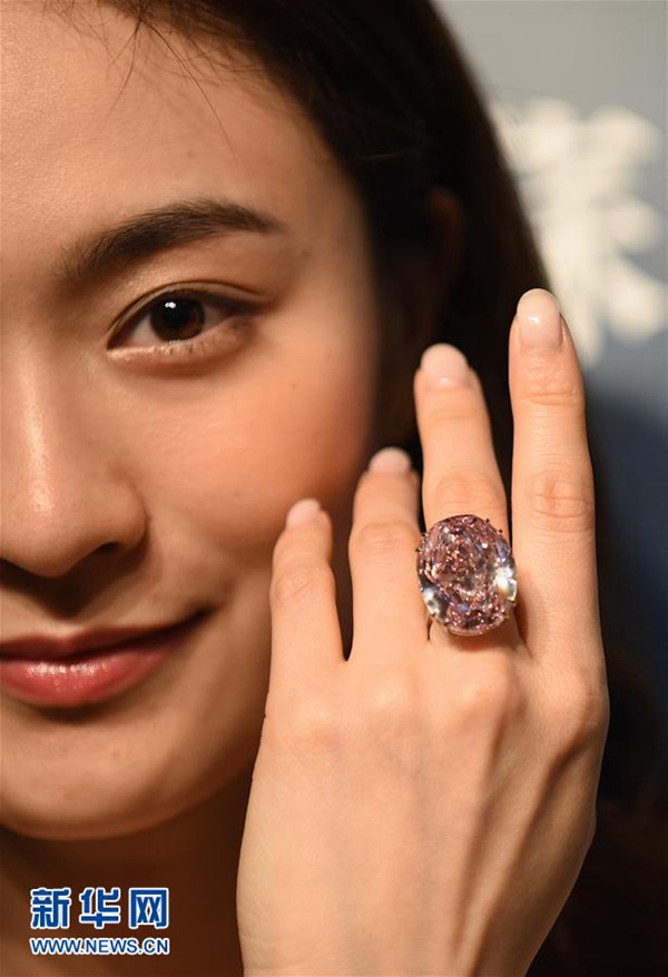 2017年4月4日 59.60克拉粉红钻香港拍卖创纪录模特在香港苏富比艺术空间举行的媒体预展上展示“粉红之星”钻石(3月29日摄)。 4月4日,一枚名为“粉红之星”的59.60克拉椭圆形内部无暇艳彩粉红钻在香港苏富比瑰丽珠宝及翡翠首饰2017年春拍上以总额5亿5303.75万港元(约合7120万美元)拍出,创下世界钻石珠宝类拍卖最高价纪录。新华社记者刘昀摄 新华社香港4月4日电(记者丁梓懿)香港苏富比瑰丽珠宝及翡翠首饰2017年春拍4日晚在香港会展中心举行,其中备受瞩目的拍品“粉红之星”——重达59.60克拉椭圆形内部无暇艳彩粉红钻以约5.53亿港元成交,刷新了全球钻石的拍卖纪录。 当晚,“粉红之星”以4.9亿港元落槌,加上佣金,最终以约5.53亿港元成交。它是美国宝石学院历来评定过的最大颗内部无暇艳彩粉红钻,此前估价约为4.6亿港元。 “粉红之星”原石重132.5克拉,由戴·比尔斯公司于1999年在非洲开采时得到,经过两年的精心打磨及切割而成。其颜色及净度皆获美国宝石学院评定粉红钻的最高评级,化学成分方面更被评定为最纯净的Type Ⅱa品质。 据悉,苏富比曾于2010年在瑞士日内瓦拍卖一颗粉红钻石,名为“The Graff Pink”(“格拉芙粉红钻”)。这颗钻石重24.78克拉,当年的拍卖价是4620万美元,创下粉红钻石的世界拍卖纪录,同时创下任何钻石、宝石及珠宝世界拍卖纪录,如今这个世界纪录被“粉红之星”打破。
