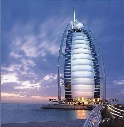 这座全世界最高的酒店、帆船酒店,高321米,比埃菲尔铁塔还高上一截。它建在一个离阿联酋迪拜海岸280米处的人工岛上,由一条堤岸跟内陆连接。工程总共花了5年的时间,2年半时间在海上填出人工岛,2年半时间用在建酒店本身,使用了9000吨钢铁,在40米深的海底打了250根基建桩柱。