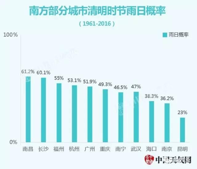 在每年的清明节气这15天里,把当天降雨量达到0.1毫米或以上的日子作为一个雨日,那么,通过统计1961-2016年在清明节气期间的降雨数据,湖北在清明时节的雨日概率为47%,换句话说,就是在清明节气的15天里,湖北近一半的日数都是在下雨哒~