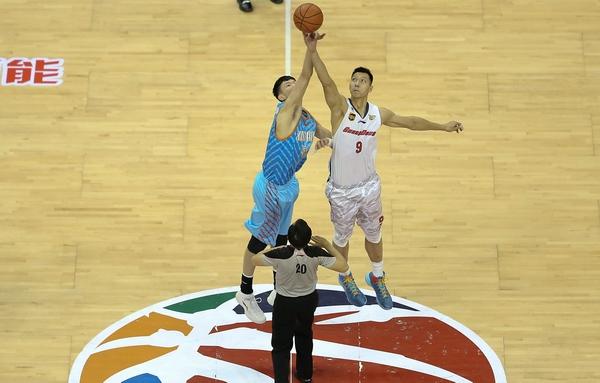 4月5日,新疆队球员周琦(左)和广东队球员易建联在比赛开始时跳球。 摄影:新华社记者 曹灿