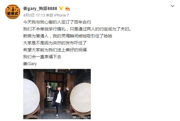 Gary表示,妻子是圈外人士,两人没有公开举办结婚仪式,突然宣布结婚的确会令人感到意外,但是希望大家能为他们送上祝福。