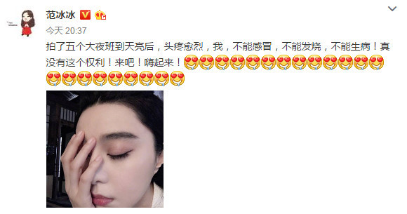 腾讯娱乐讯 4月6日消息,范冰冰在微博晒出一张自拍照,并发文:“拍了五个大夜班到天亮后,头疼愈烈,我,不能感冒,不能发烧,不能生病!真没有这个权利!来吧!嗨起来!”照片中,范冰冰一手捂着脸,双眼紧闭,看似十分的疲惫辛苦。