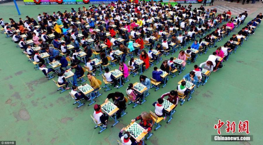 2017年4月6日,辽宁沈阳,“我跟孩子学下棋 亲子娱乐共成长”千人对弈活动在沈阳市铁路第三小学举行。当天是该校校园开放日,家长走进校园,走进课堂,和孩子学习、对弈国际象棋。据了解,该校是全国国际象棋后备人才培训基地,国际象棋是学校校本课程。 沈阳 摄 图片来源:视觉中国