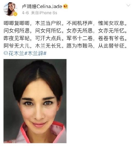 近日,中美混血女演员、《战狼2》女主演卢靖姗在微博中发布了一张疑似迪士尼真人版《花木兰》(赵薇版动画版)的定妆照,并以《木兰辞》配文,网友纷纷猜测,该片花木兰角色人选或已花落卢靖姗。