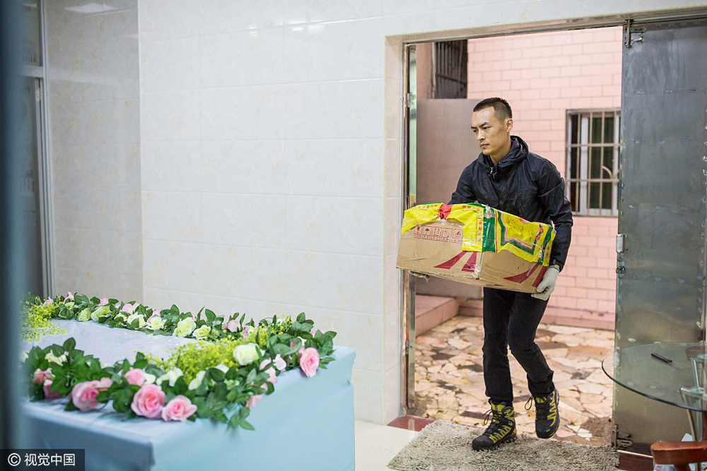 2017年3月31日下午3时许,广州市白云区一处小山头的竹林深处,网名为“摆渡人”的刘先生正打开密封箱抱出刚刚过世的小狗“仔仔”,轻柔地将它放在一张鲜花环绕的小床上。