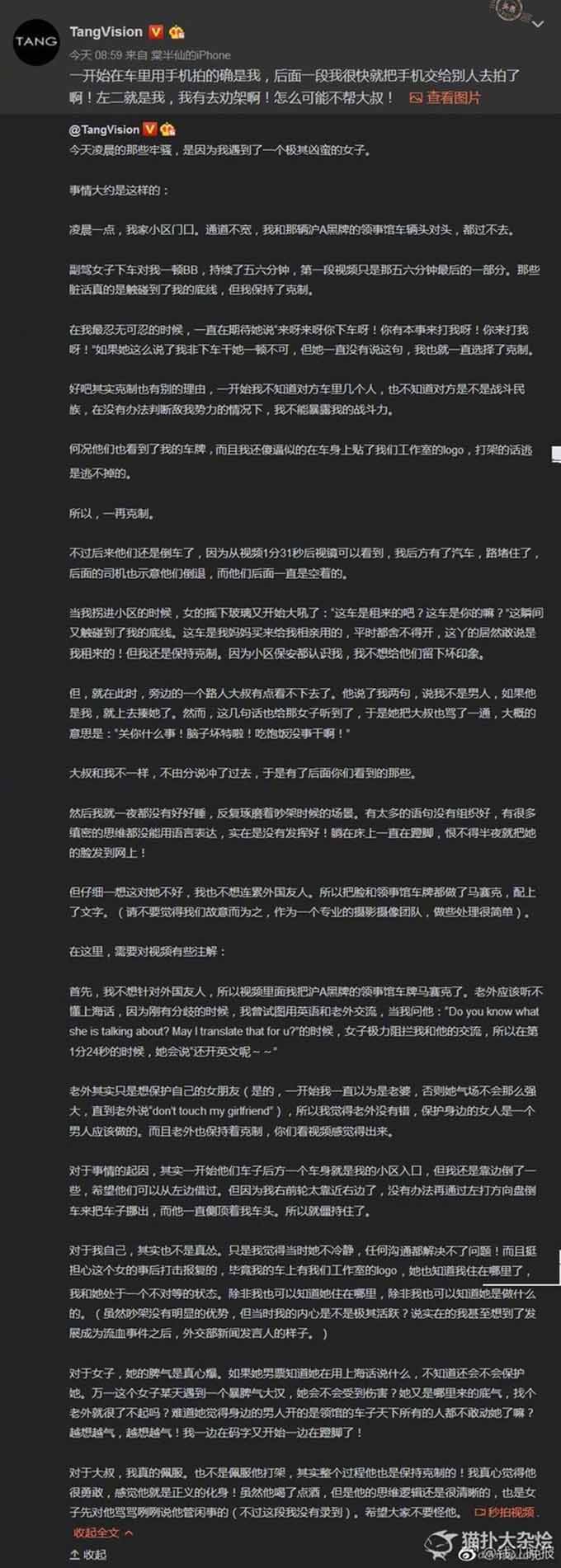 【上海现史诗级骂街】今日,一名网友发布一则视频微博,称今天凌晨在自家小区门口与一辆沪A黑牌的领事馆车辆相遇。因道路狭窄,两辆车头对头都过不去,黑牌车上下来一名女子开始骂人。