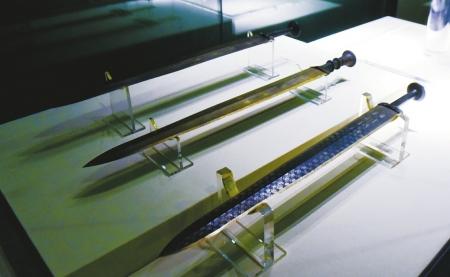 越王勾践剑,剑身布满菱形暗纹,剑格两面分别镶嵌蓝色玻璃和绿松石,历经2400余年,仍然纹饰清晰精美,削铁如泥。