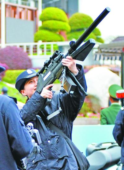 在起跑点前,一名警察端着无人机反制枪,搜寻随时可能闯入禁区的无人机记者喻志勇 摄