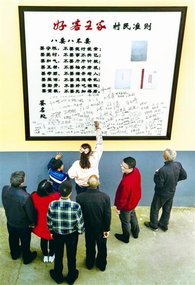 王家村村民在《村民准则》展板上签名。