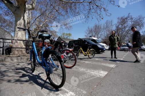 北海公园大门附近,违规停靠在斑马线上的共享单车。