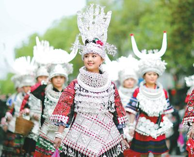 4月10日,苗族同胞参加盛装游演活动。当日,贵州省台江县苗族同胞迎来一年一度的苗族姊妹节。姊妹节期间将举行苗族盛装游演、千名绣娘织苗绣、原生态斗牛、赛苗歌等一系列传统活动。