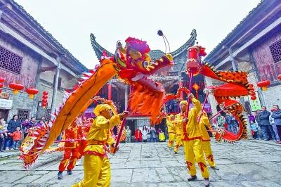 湖南省郴州市桂阳县洋市镇庙下古村村民在进行龙狮表演。李科摄 光明图片/视觉中国