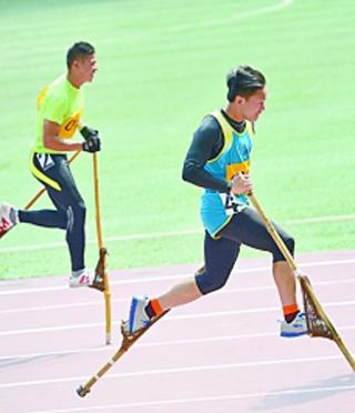第十届全国少数民族运动会上,高脚竞速运动员奋力向前。刘文华摄 光明图片/视觉中国