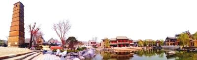据园区负责人介绍,园区以唐代新潭、宋代文峰塔、金代城墙为地标,统率10个主题场景,周边环绕古风建筑。