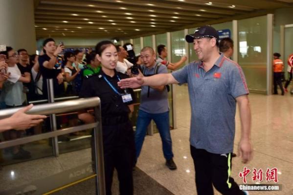 据悉,目前交接工作正在进行中,李永波表示对于教练团队竞聘流程并不了解。图为2016年8月22日,中国奥运羽毛球队抵达首都机场,被早已等候在现场的球迷层层包围。图为李永波走出机场,受到热情迎接。中新网记者 金硕 摄