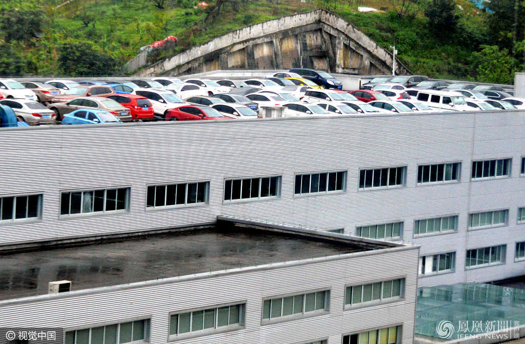 2017年4月10日,重庆,渝南大道旁,60余辆汽车停放在一栋房屋的7楼顶楼,楼顶变身“空中停车场”,被网友戏称为“最牛空中停车场”。