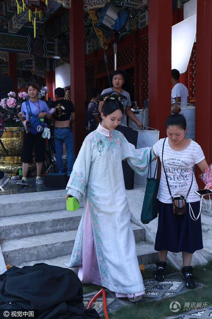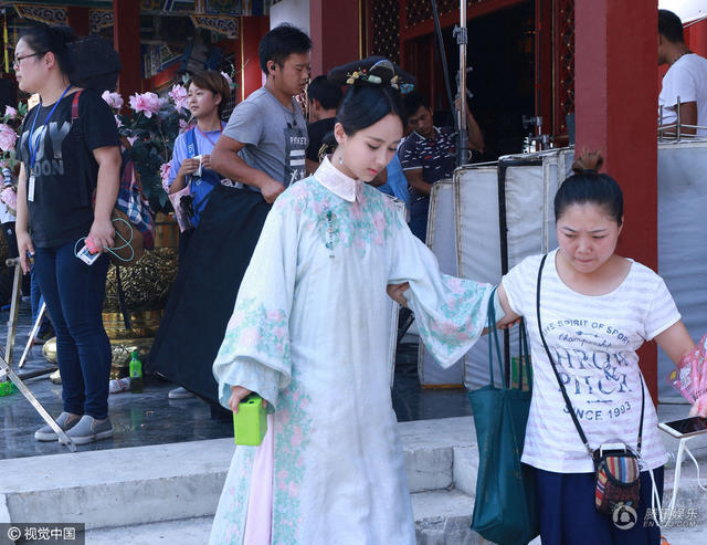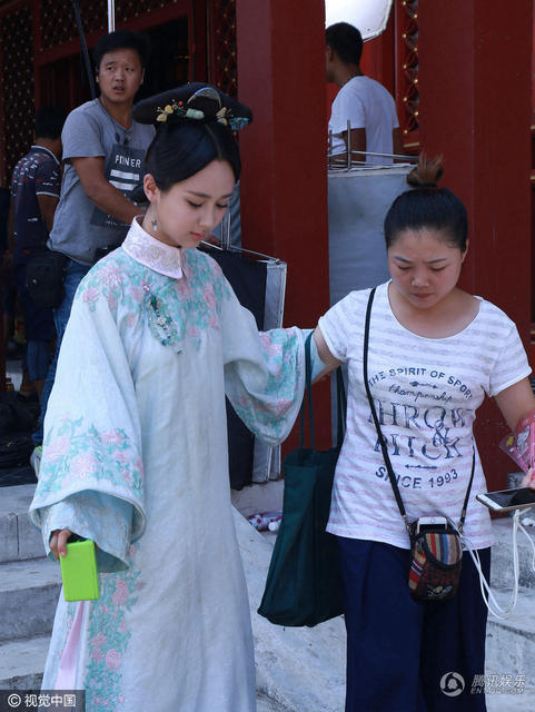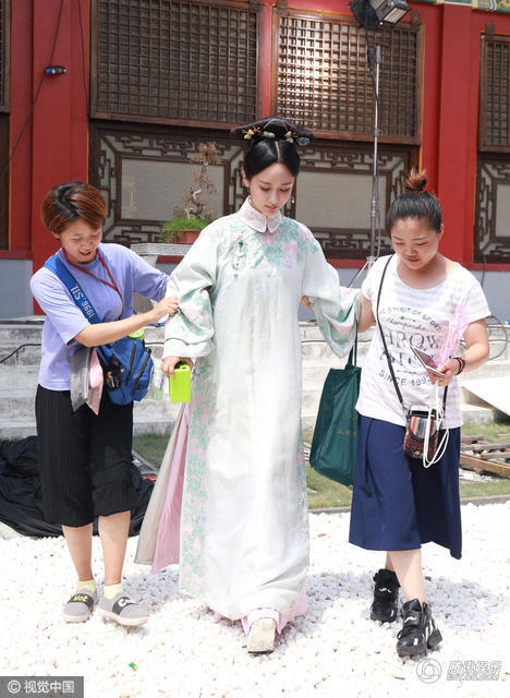 杨紫变身格格,工作人员在一旁搀扶资料图。