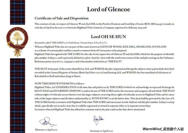 4月11日晚,吴世勋粉丝站子发微博称为了庆祝偶像的生日,在苏格兰购买了一块土地,并晒出购买证书、被购买土地和周围环境地图、购地编号。此外还会获得到政府承认的贵族勋爵的称号。