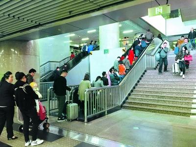 “电梯太小人太多,到了节假日就得排队。这么大的火车站,电梯还不如商场。”推着婴儿车,徐培一家人走入夹层停车场连通地下一层的电梯。这个国外知名品牌的电梯,只在停车场和地下一层之间来回运行,标称乘员限额为13人。由于乘坐的旅客均带着行李箱和婴儿车,电梯里只站了8个人就显得非常拥挤。