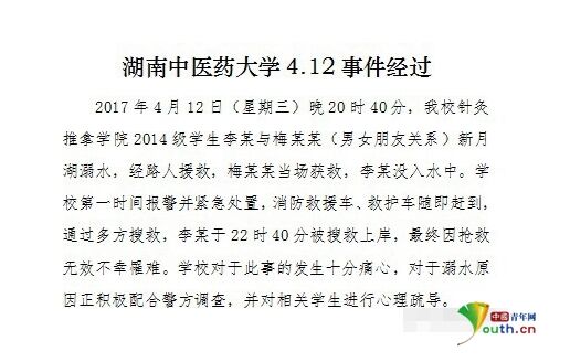 事件发生后,一份名为《湖南中医药大学4.12事件经过》的情况声明在学校内的各种QQ群内传播。这份情况声明中称,溺水两人为男女朋友关系,梅某某当场获救,而李某在落水后两小时被搜救上岸,但最终因抢救无效不幸罹难。