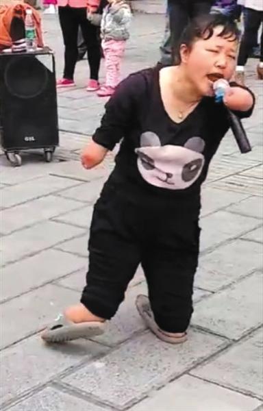 视频中的女子跪在地上卖唱,残缺的左手被一根蓝色布带和话筒缠绕在一起,右手只剩半截,在空中随着音乐节奏挥舞。再往下看,她没有脚掌,支撑全身的是折进灰色拖鞋里干瘪变形的小腿。