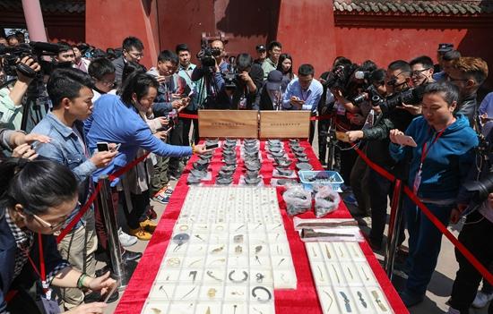 4月13日,媒体记者在拍摄展示的四川江口沉银遗址考古发掘成果。四川彭山江口沉银遗址2016年至2017年度考古发掘工作已结束,出水珍贵文物3万余件,初步发现直接与张献忠“大西国”相关的文物上千件,取得重大突破。新华社记者 江宏景/摄
