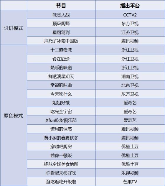 2014年前后,由于《中国好声音》、《奔跑吧兄弟》等一系列引进模式的综艺节目爆红,带领了国内的模式引进潮流,而美食综艺也正处于内容转型期和数量井喷期,在市场需求扩大与创意水平不足的矛盾下,美食综艺借鉴国外的成熟模式成为了一个必然阶段。《味觉大战》、《顶级厨师》、《星厨驾到》都脱胎于欧美国家流行的厨艺竞赛模式,而《拜托了冰箱中国版》则是引进的韩国模式。事实证明,引进模式的节目在内容创意上区别于以往的厨艺教学,全新的节目形态也获得了观众的认可,帮助美食综艺焕发出新的生命。