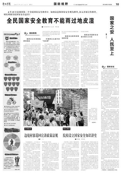 “在边境一线开展国家安全教育,增强了官兵、民兵和边民守护边境安全意识,目前千余民兵和边民与边防官兵一道巡逻执勤,形成了人人是哨兵、村村是堡垒的管边控边格局。”军分区政治部主任张继乾深有感触地说。