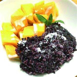做法:紫糯米洗净,用凉水泡3-4小时,将米和泡紫米的水,一起倒入电饭锅中煮好。芒果去皮,切成小粒备用。紫米饭盛入盘中,放入芒果粒,将椰汁用微波炉加热后,淋在紫米饭上即可。