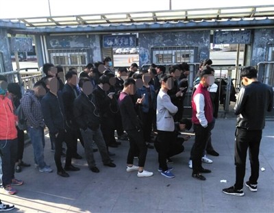 4月13日早上7时40分左右,新宫地铁站B口外,新京报记者看到约有40名替考者在现场集合,并排成几列纵队,多为青年男子。
