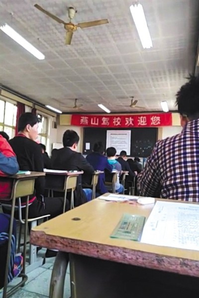 下车后,替考者们被带入一间教室。新京报记者发现,考场内已有两纵列座位被坐满,多为四五十岁的男性。教室上方悬挂着一条“燕山驾校欢迎您”的条幅,教室黑板上张贴着一张考试须知。