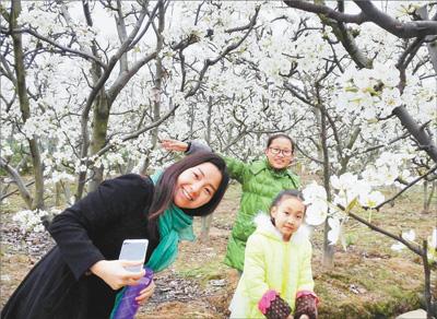 图为游客在大井村梨花园拍照。