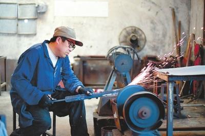 4月12日,铸剑师傅在用机器粗磨剑条。 |