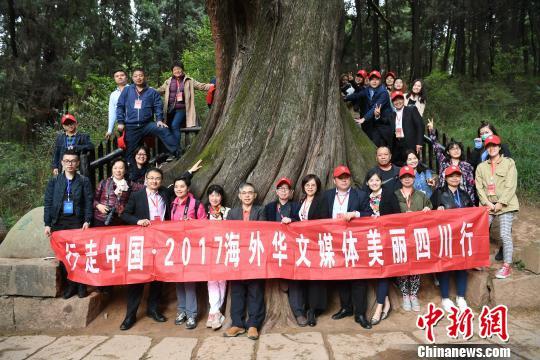 海外华文媒体代表在广元市剑阁县翠云廊采风,在千年古树前合影。 张浪 摄