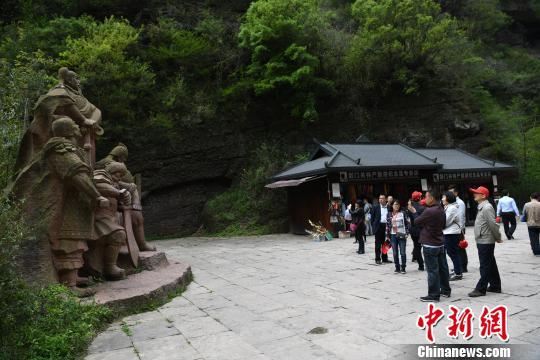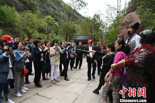 海外华文媒体代表在广元市剑阁县剑门关景区采风,拍摄诸葛亮扮演者。 张浪 摄