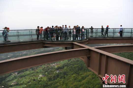 海外华文媒体代表在广元市剑门关玻璃观景平台采风。 张浪 摄