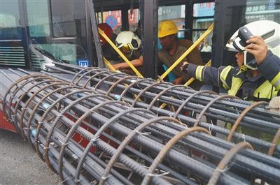 据了解,三轮车上钢筋约16米长,相撞后穿进公交车后车门附近位置。