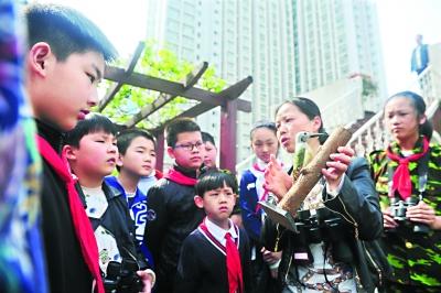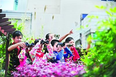 开完班会,孩子们来到教学楼顶的屋顶花园,在科学老师成英的带领下认识珍稀鸟类,悬挂安放鸟窝,用望远镜观察城市里的鸟类。