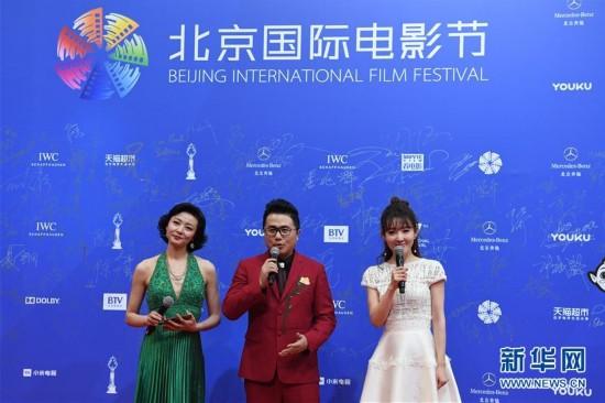 4月16日,向真(左)、曹扬(中)、郭玮主持红毯仪式。当日,第七届北京国际电影节在北京怀柔区国家中影数字制作基地开幕。 新华社记者 申宏 摄