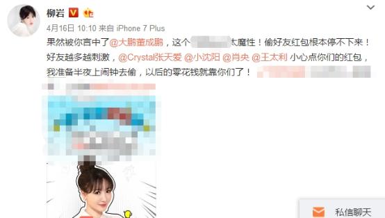 柳岩在微博上表示:“果然被你言中了@大鹏董成鹏,这个太魔性!偷好友红包根本停不下来!好友越多越刺激,@Crystal张天爱 @小沈阳 @肖央 @王太利 小心点你们的红包,我准备半夜上闹钟去偷,以后的零花钱就靠你们了!”