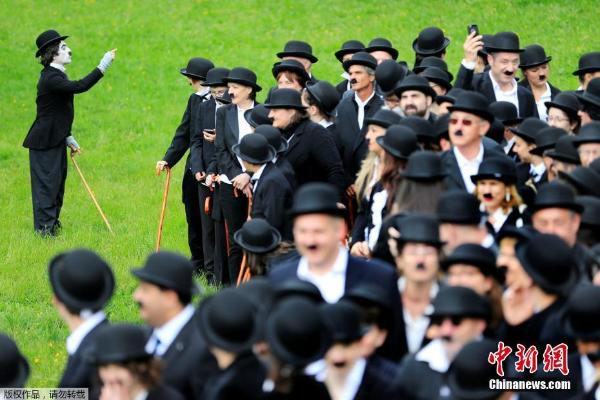 当地时间2017年4月16日,瑞士Corsier sur Vevey,662人装扮成“流浪汉”聚会,纪念卓别林128周年诞辰。